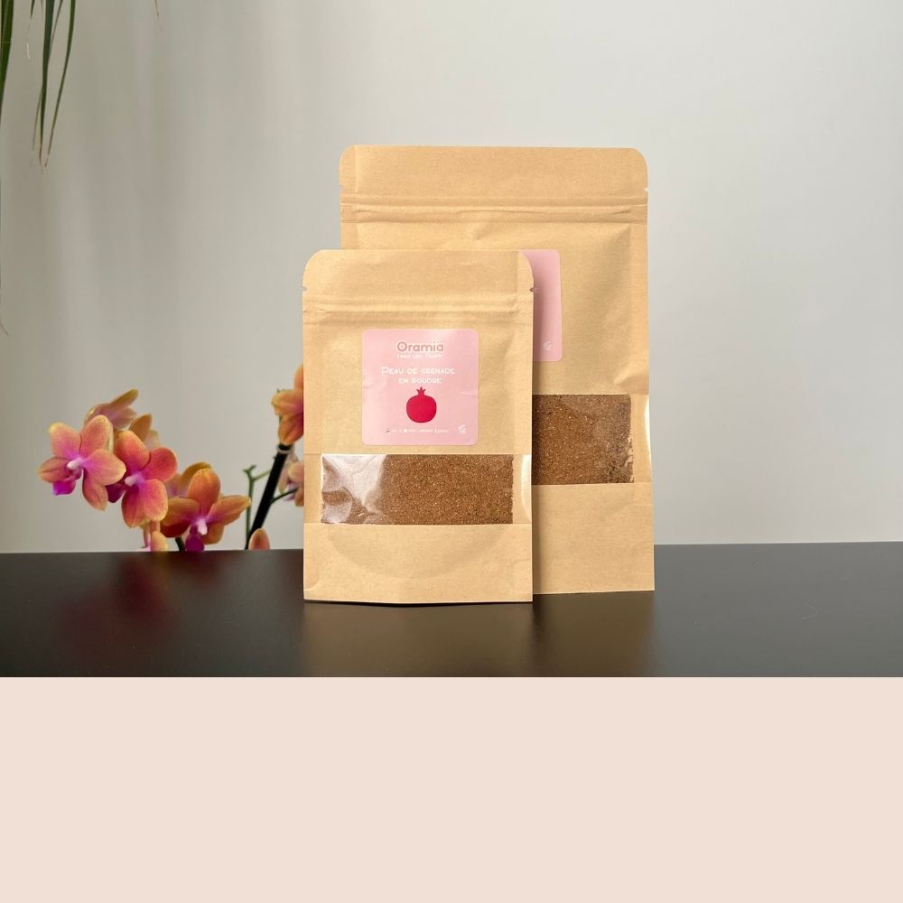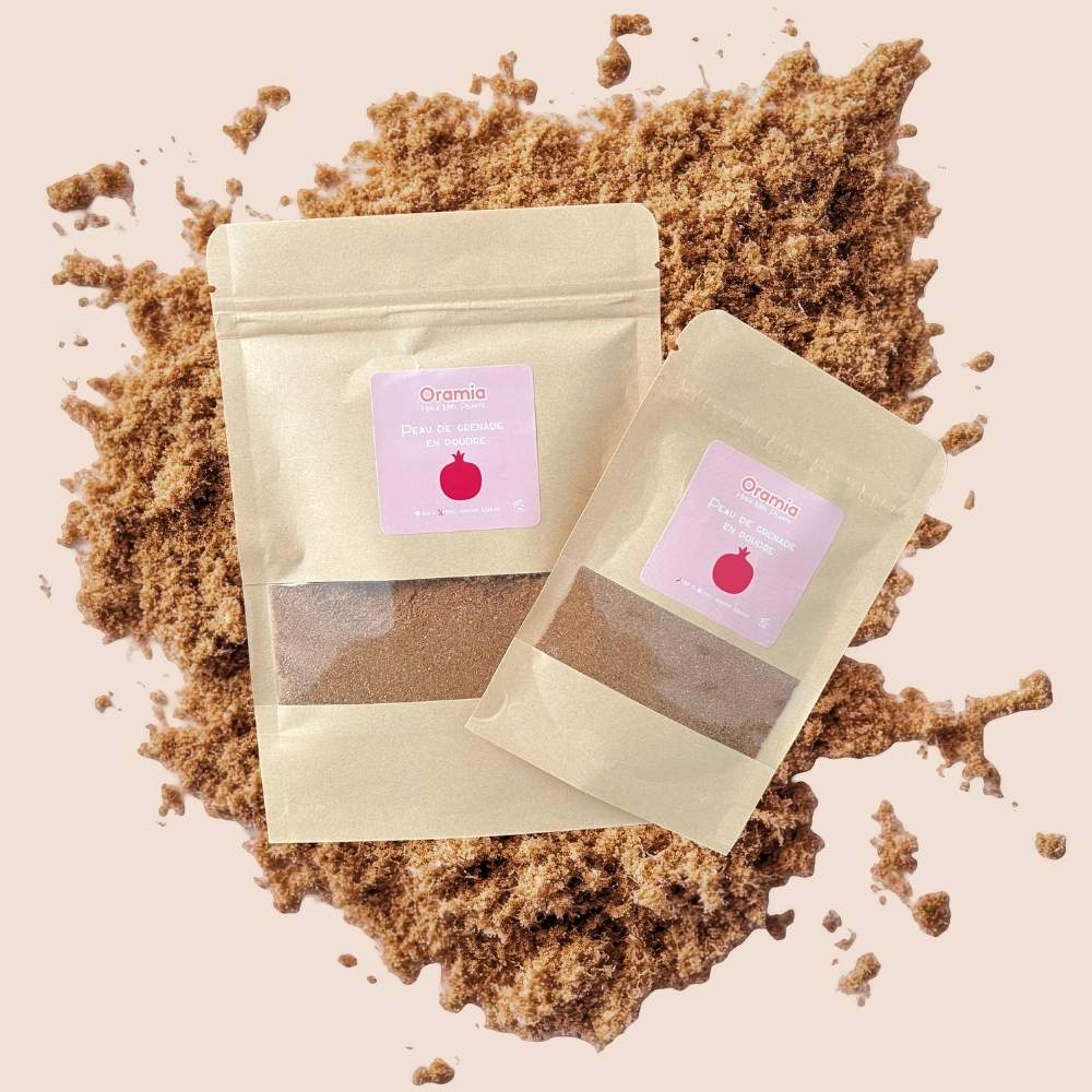 Chez Oramia, nous vous proposons de la poudre de peau de grenade, conditionnée dans un sachet kraft refermable de 20g ou 50g, pratique et économique pour un usage quotidien