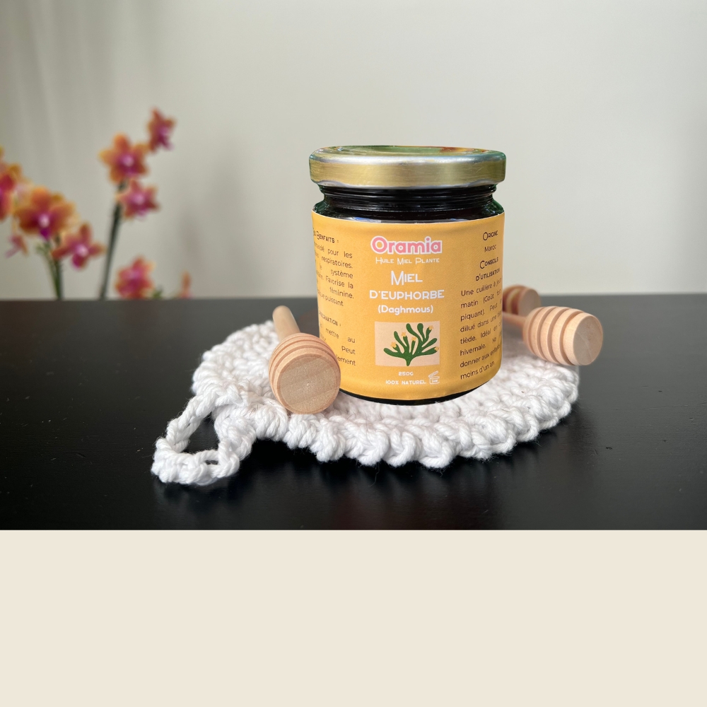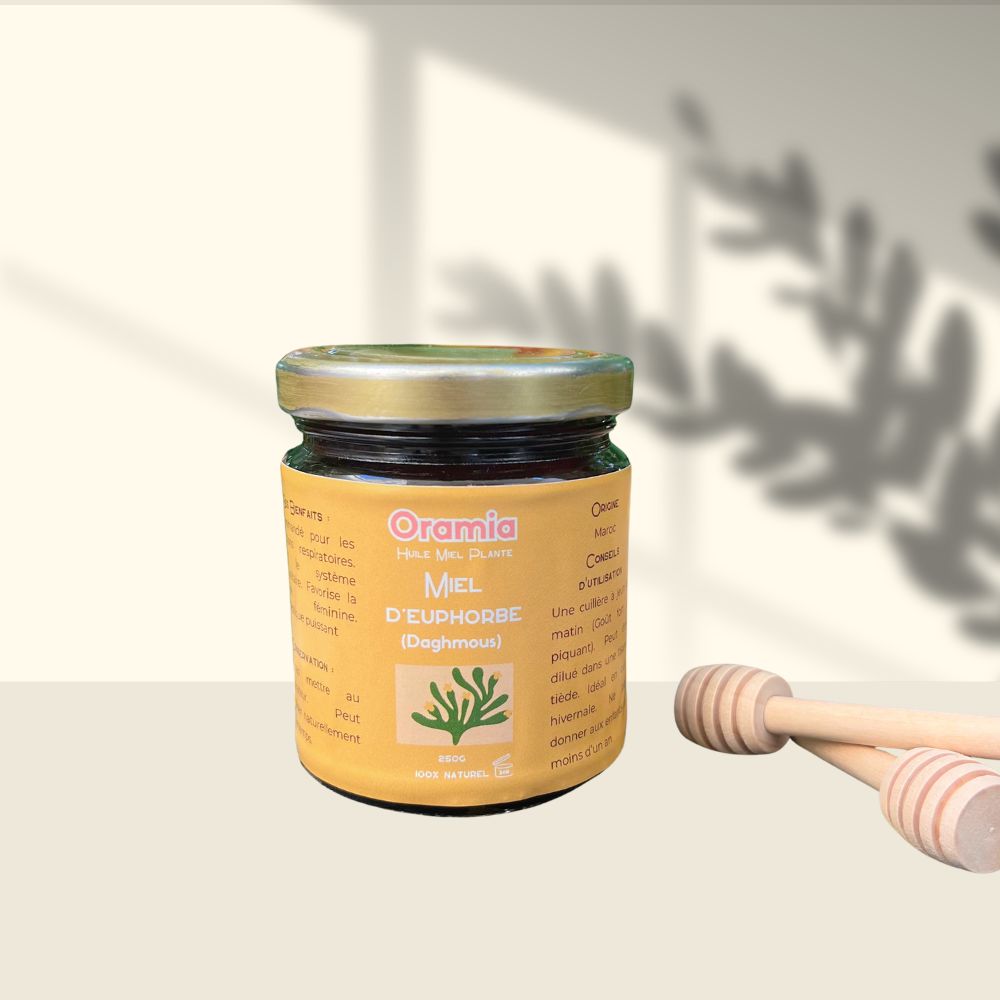 Découvrez le miel d’euphorbe ou « miel de daghmous » 100% naturel – origine Maroc, disponible en pot de 250g chez Oramia