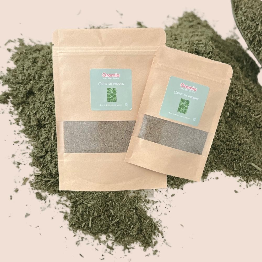 Découvrez l’ortie en poudre – Oramia, proposé en deux formats : 20g ou 50g. Un véritable allié bien-être global.